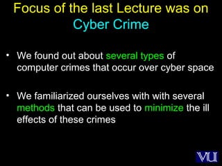 The document discusses the social implications of computing, focusing on the nature of cyber crimes, their impacts on businesses and personal privacy, and the evolution of work and education due to technology. It highlights both the advantages, such as improved communication and access to information, and the disadvantages, such as reduced personal interactions and increased surveillance. The lecture emphasizes the necessity for computing professionals to be aware of the societal consequences of their innovations.