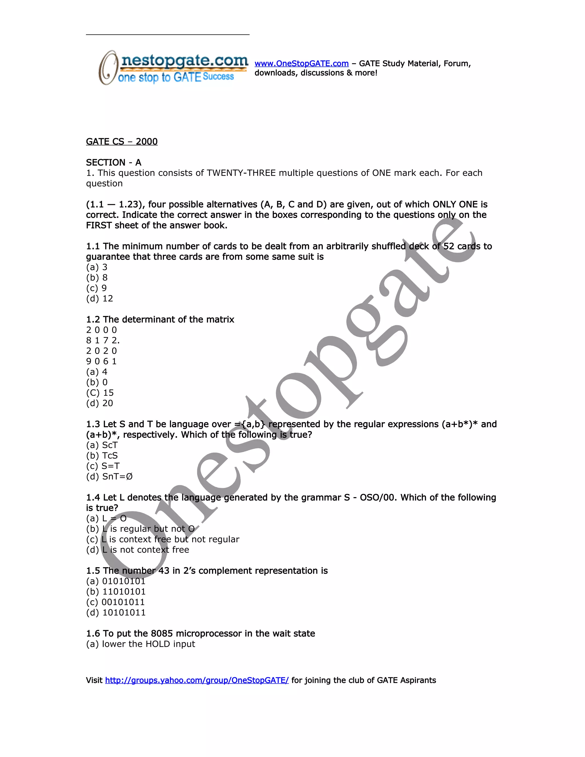 This document contains a GATE exam question paper from 2000 with multiple choice questions in sections A and B testing knowledge of computer science topics. Section A contains 23 one-mark questions and section B contains 26 two-mark questions covering areas like algorithms, data structures, computer architecture, databases and more. The questions test understanding of concepts like binary trees, graphs, complexity analysis, regular expressions and more through matching, reasoning and problem solving questions.