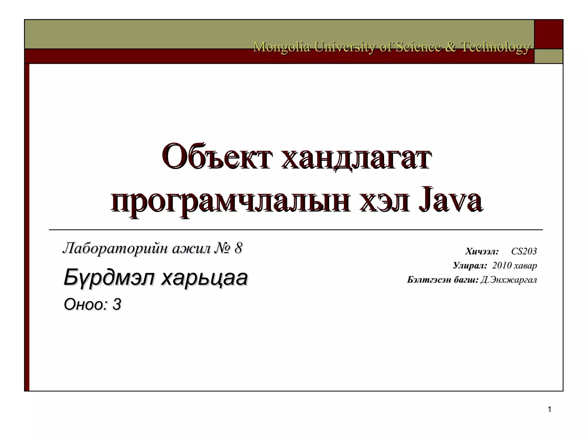 Объект хандлагат програмчлалынхэл Java Хичээл : CS203 Улирал : 2010 хавар Бэлтгэсэн багш : Д.Энхжаргал Mongolia University of Science & Technology Лабораторийн ажил № 8 Бүрдмэл харьцаа Оноо: 3 - 2.