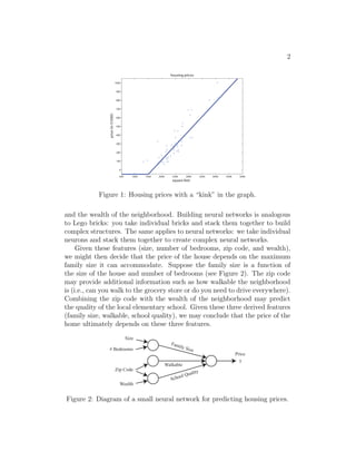 1. The document introduces neural networks and discusses representing simple neural networks as "stacks" of individual neuron units. It uses a housing price prediction example to illustrate this concept.