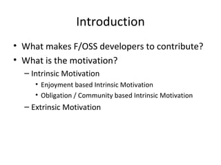 The article examines the motivations behind contributions to free and open-source software (f/oss) projects, identifying intrinsic motivations such as enjoyment and creative flow, as well as extrinsic motivations like financial incentives and community obligations. It highlights the demographic profile of contributors, including a predominantly male population with an average age of 30 and various forms of training. The findings suggest that both intrinsic and extrinsic factors coexist, and that being paid does not negatively impact creativity in contributions.