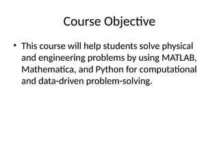 This document provides an overview of MATLAB, Mathematica, and Python for 5th semester students in a CS-301 course aimed at enhancing computational skills. It highlights the applications, examples, and strengths of each tool, emphasizing their roles in solving physical and engineering problems. The course seeks to equip students with practical experience in using these technologies for data-driven problem-solving.