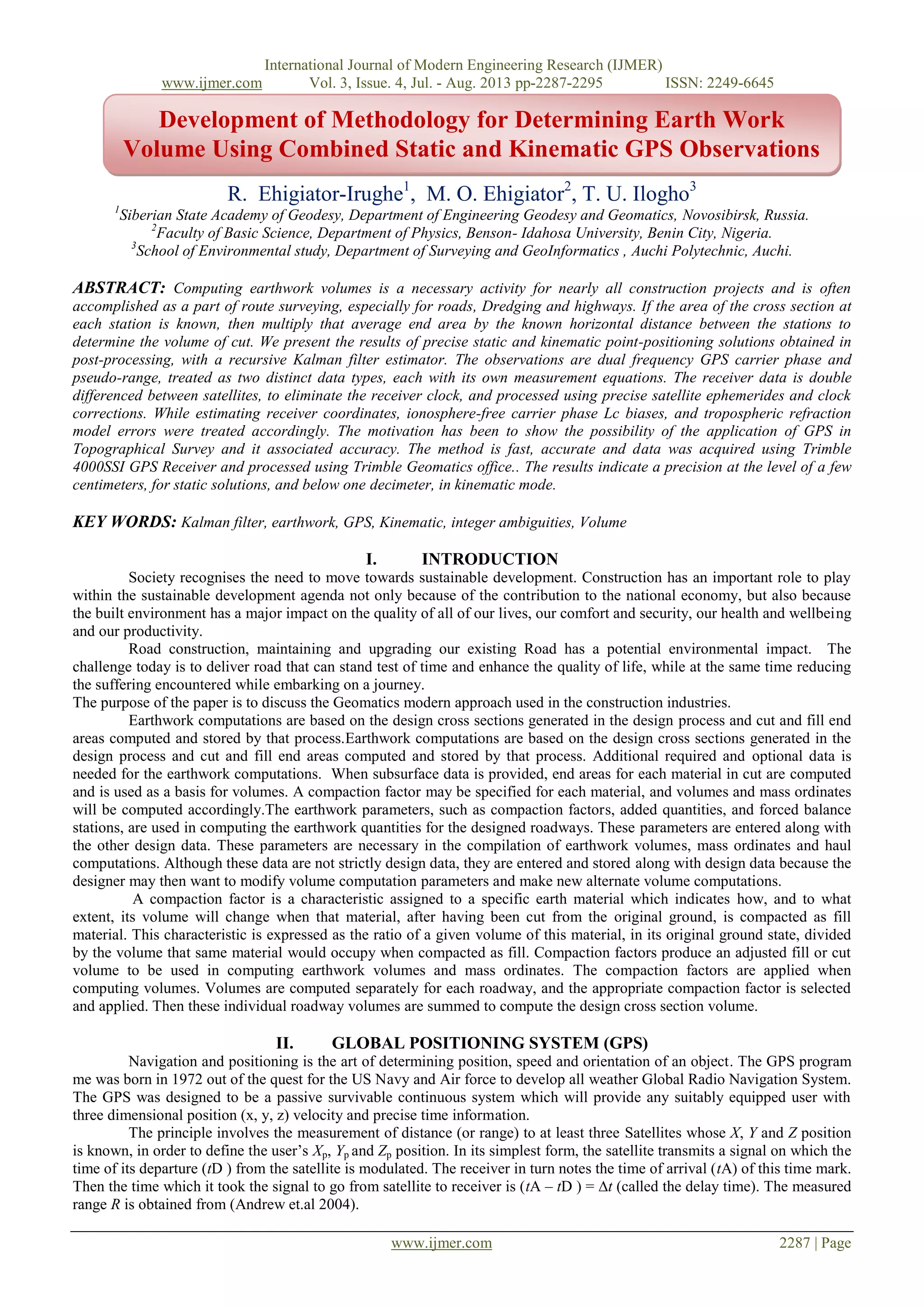 This document discusses the implementation of GPS technology in calculating earthwork volumes for construction projects, particularly in road construction. It highlights the use of precise static and kinematic positioning methods utilizing dual frequency GPS to achieve high accuracy in measurements, noting the importance of factors such as compaction and atmospheric delays. The study emphasizes the innovative geomatics approaches to improve efficiency and sustainability in construction practices.