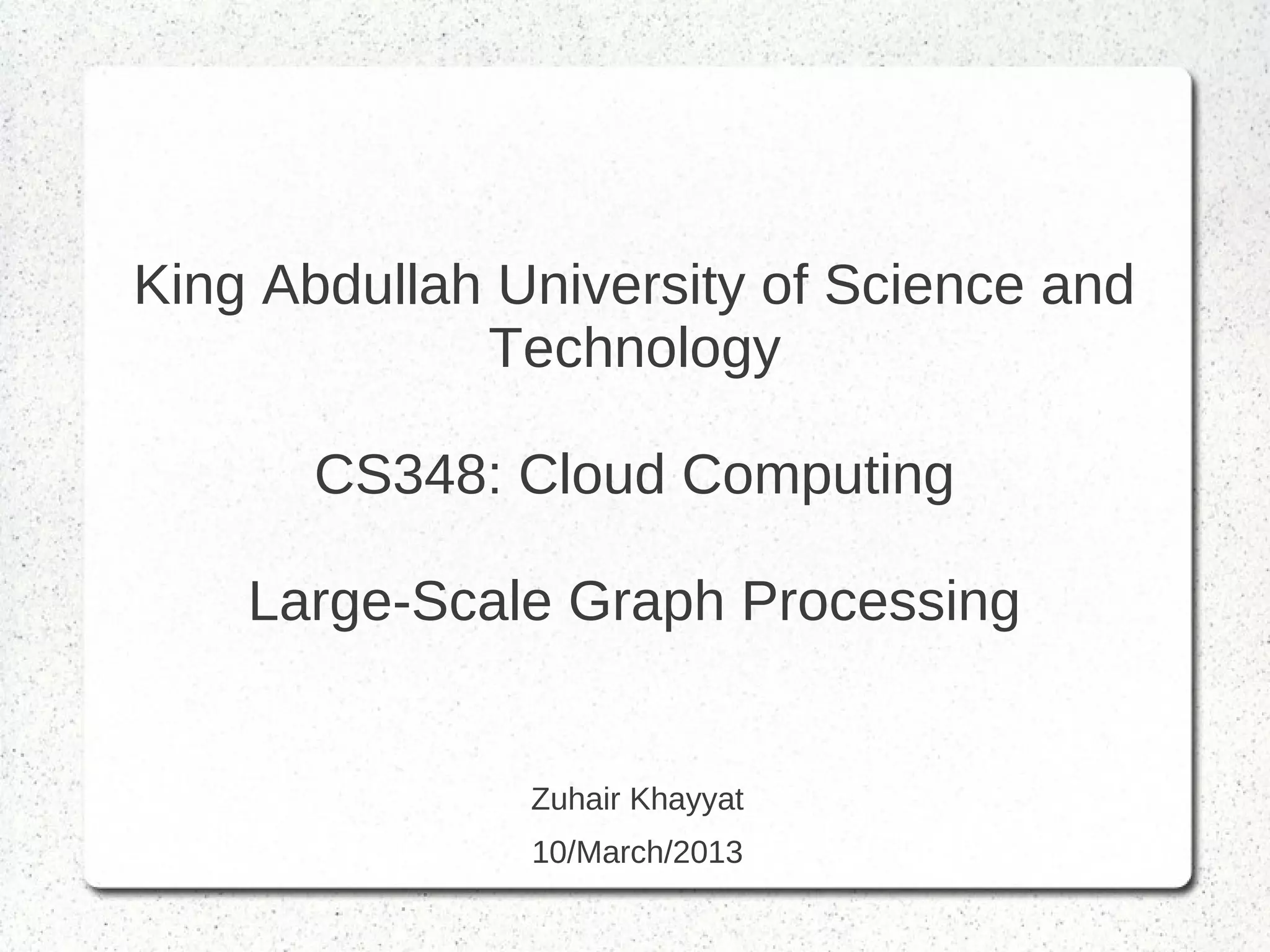 This document discusses large-scale graph processing and the challenges involved. It introduces Pregel, an influential graph processing system based on the bulk synchronous parallel model. Key aspects of Pregel are explained such as its vertex-centric approach, use of supersteps with messaging between steps, and guarantees of message delivery. The document also discusses Mizan, a graph processing system developed locally that aims to improve load balancing through dynamic graph partitioning between supersteps. Examples of graph algorithms like PageRank and Max are provided in the Pregel and Mizan models. Finally, the class is assigned to install and run Mizan on a single machine following an online tutorial.