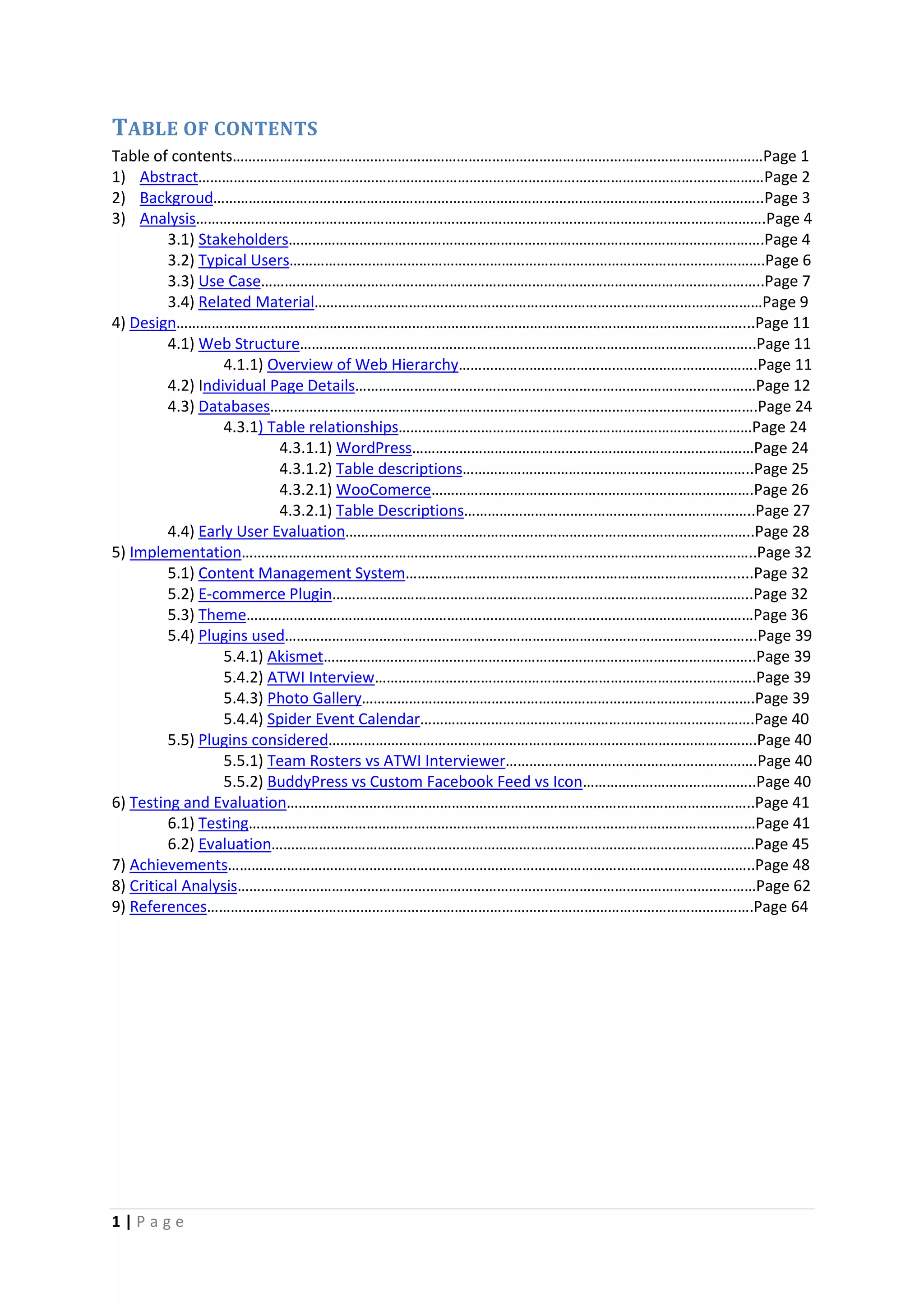 This document provides details on the design and development of a website for the Aberystwyth Men's Basketball team. It includes sections on business analysis, design, implementation, testing, and evaluation. The business analysis identifies stakeholders such as current players, coaches, and committee members and how the site will benefit them. Typical users are identified as male students aged 18-24 interested in learning about and joining the team. The design section outlines the WordPress-based structure and individual pages. Implementation details the use of WordPress, WooCommerce e-commerce plugin, and additional plugins. Testing involved user evaluations and tasks to identify areas for improvement. The document concludes with achievements demonstrated through screenshots and a critical analysis.