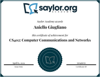 This certificate of achievement was issued on April 6, 2021 to Aniello Giugliano for successful completion of CS402: Computer Communications and Networks through Saylor Academy. The certificate ID is 31049031.