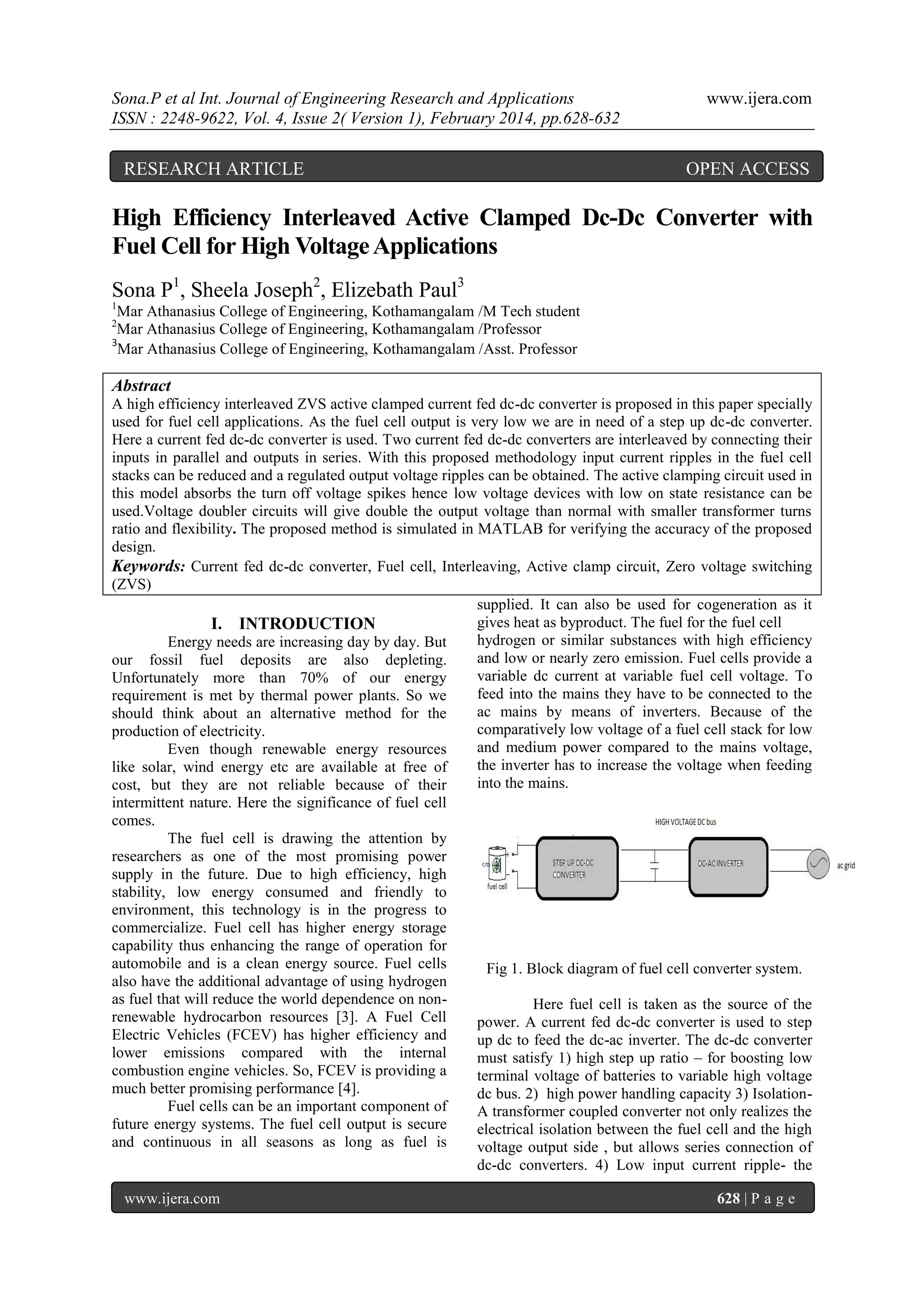 This document presents a high-efficiency interleaved active clamped DC-DC converter with a fuel cell for high voltage applications. Two current fed DC-DC converters are interleaved by connecting their inputs in parallel and outputs in series to reduce current ripples in the fuel cell and regulate output voltage ripples. An active clamping circuit is used to absorb switch turn-off voltage spikes, allowing low voltage devices with low resistance to be used. Voltage doubler circuits double the output voltage with a smaller transformer turns ratio and increased flexibility. Simulation in MATLAB verifies the proposed design's accuracy. The converter shows benefits including reduced current ripples, increased power handling, and improved voltage regulation for high power fuel cell systems.