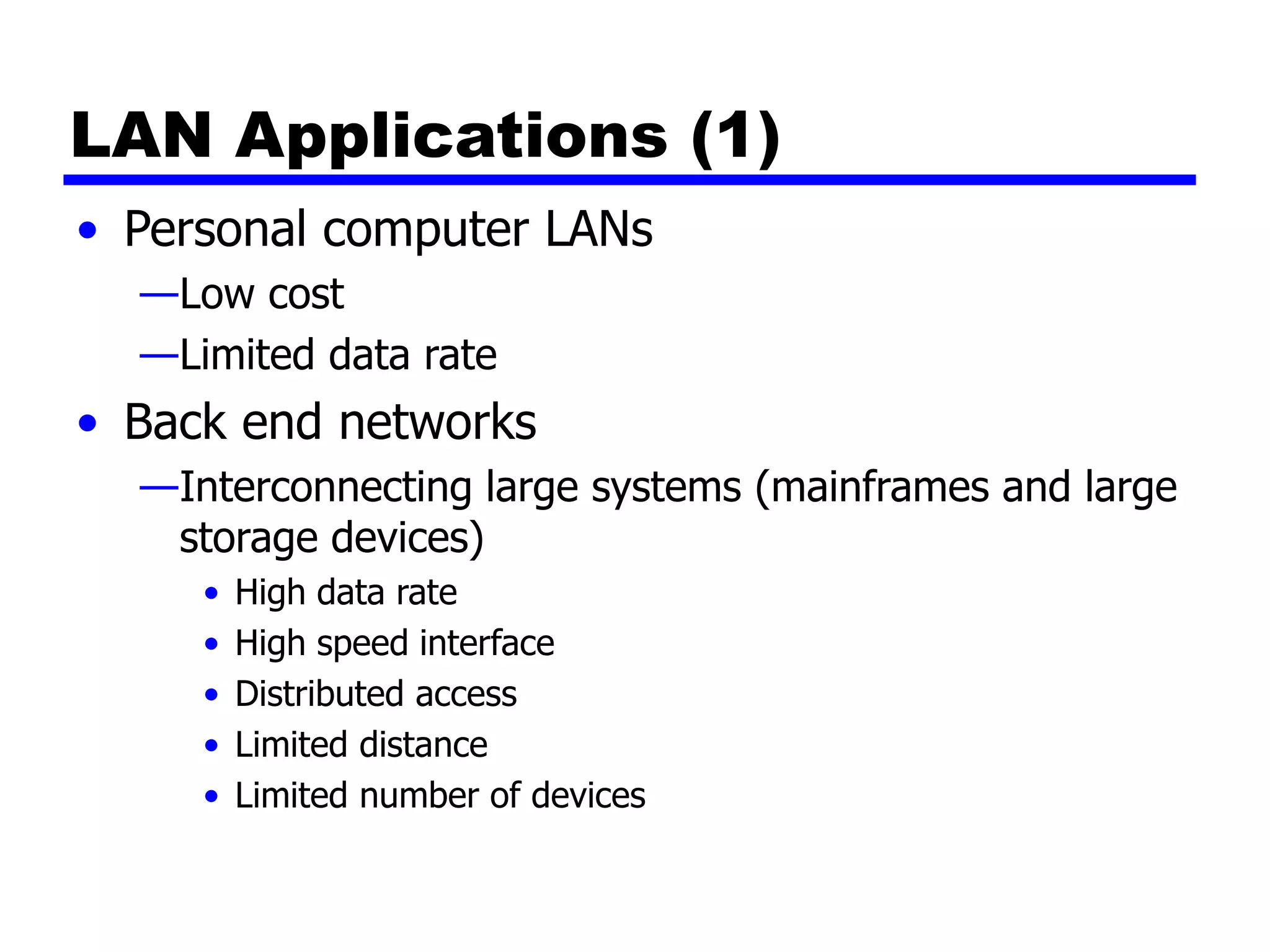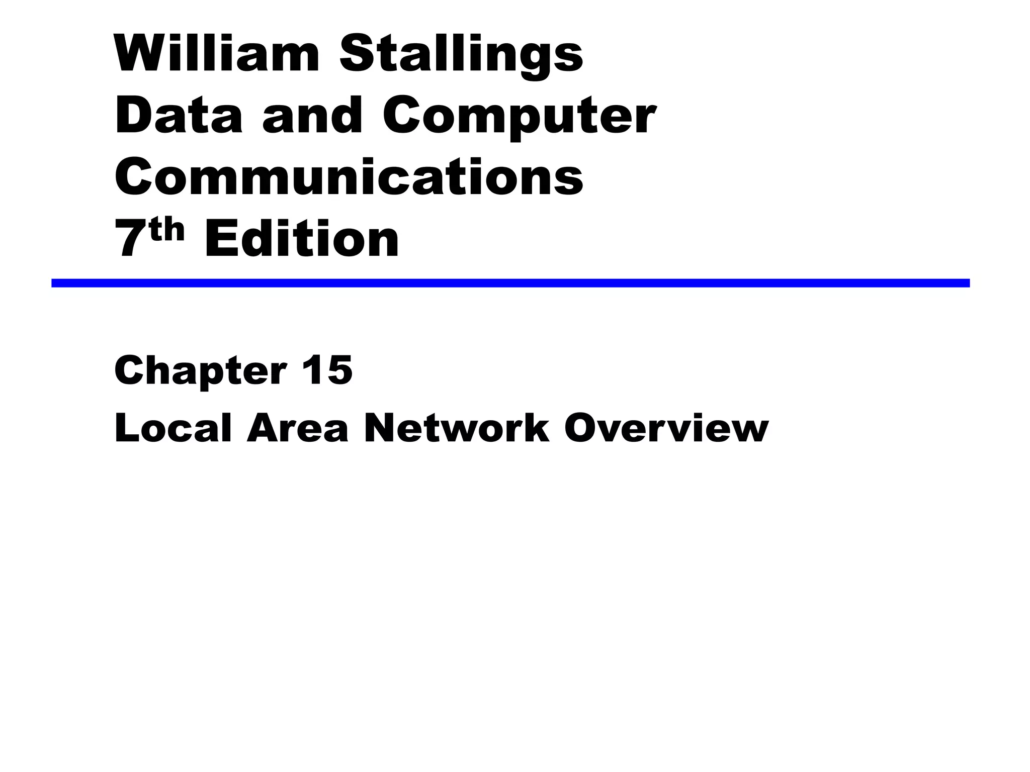 This document summarizes key points from Chapter 15 of William Stallings' book "Data and Computer Communications", 7th Edition. It discusses the applications and architectures of local area networks (LANs). The main applications covered are personal computer LANs, back-end networks, storage area networks, and high-speed office networks. Common LAN topologies like bus, ring, star and their characteristics are explained. Issues around transmission media, protocols, and network devices like bridges, hubs and switches are also summarized at a high level.