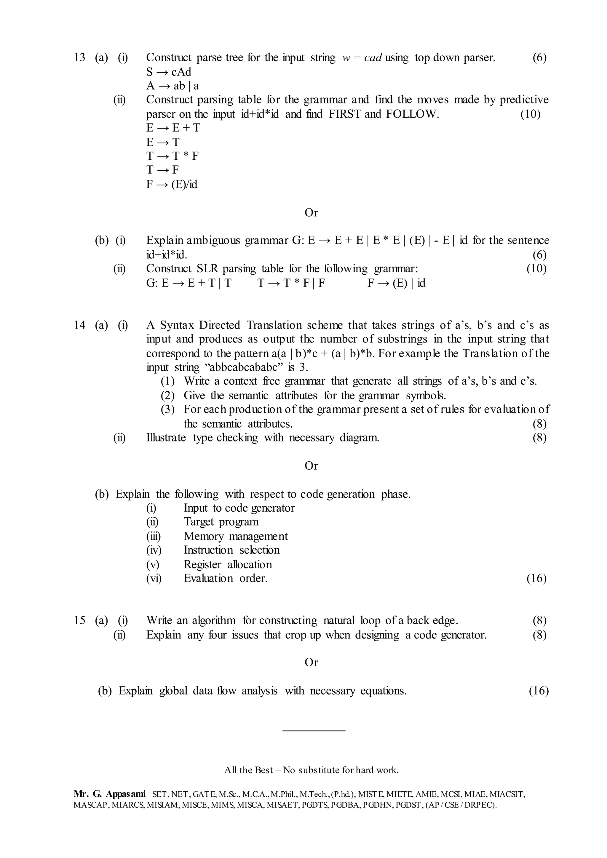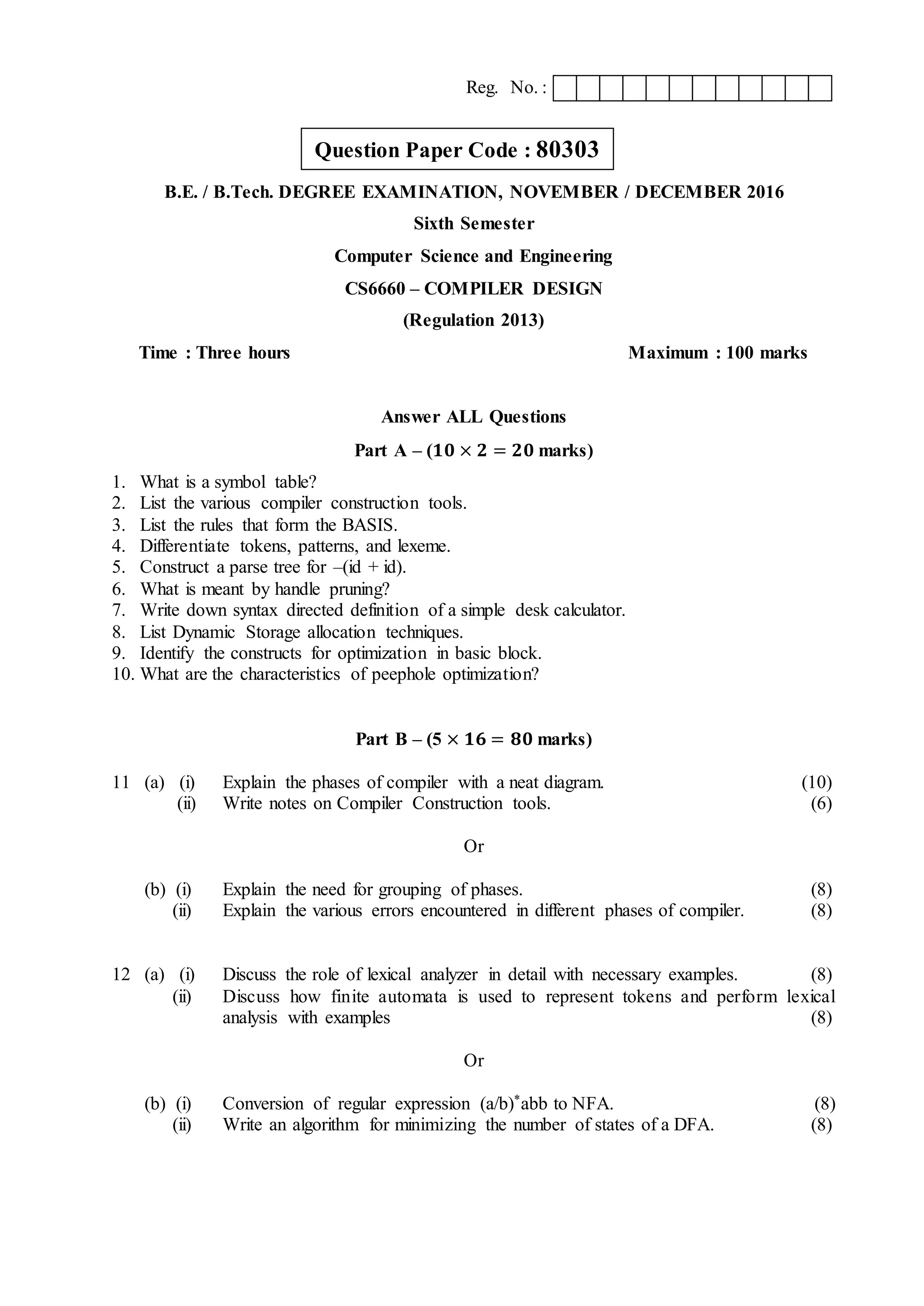 3) Questions cover topics like symbol tables, finite automata in lexical analysis, parse trees, ambiguity, SLR parsing, syntax directed translations, code generation, and optimization techniques like loop detection.
