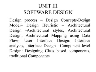 The document discusses various aspects of software design including the design process, concepts, models, heuristics, and styles. It describes software design as translating requirements into a finished product through iterative refinement. Key aspects covered include data/class design, architectural design, interface design, component design, abstraction, modularity, patterns, and information hiding. Architectural styles provide patterns for creating system architecture for given problems.