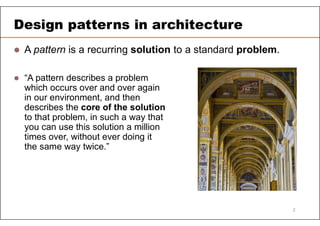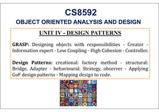 The document discusses design patterns and principles for object-oriented design. It covers the GRASP patterns for assigning responsibilities to objects, including Creator, Information Expert, Low Coupling, High Cohesion, and Controller. It also discusses the three main categories of design patterns from the Gang of Four (GoF): creational patterns like Factory Method, structural patterns like Bridge and Adapter, and behavioral patterns like Strategy and Observer. The document provides examples of applying these patterns and principles to object-oriented analysis and design.