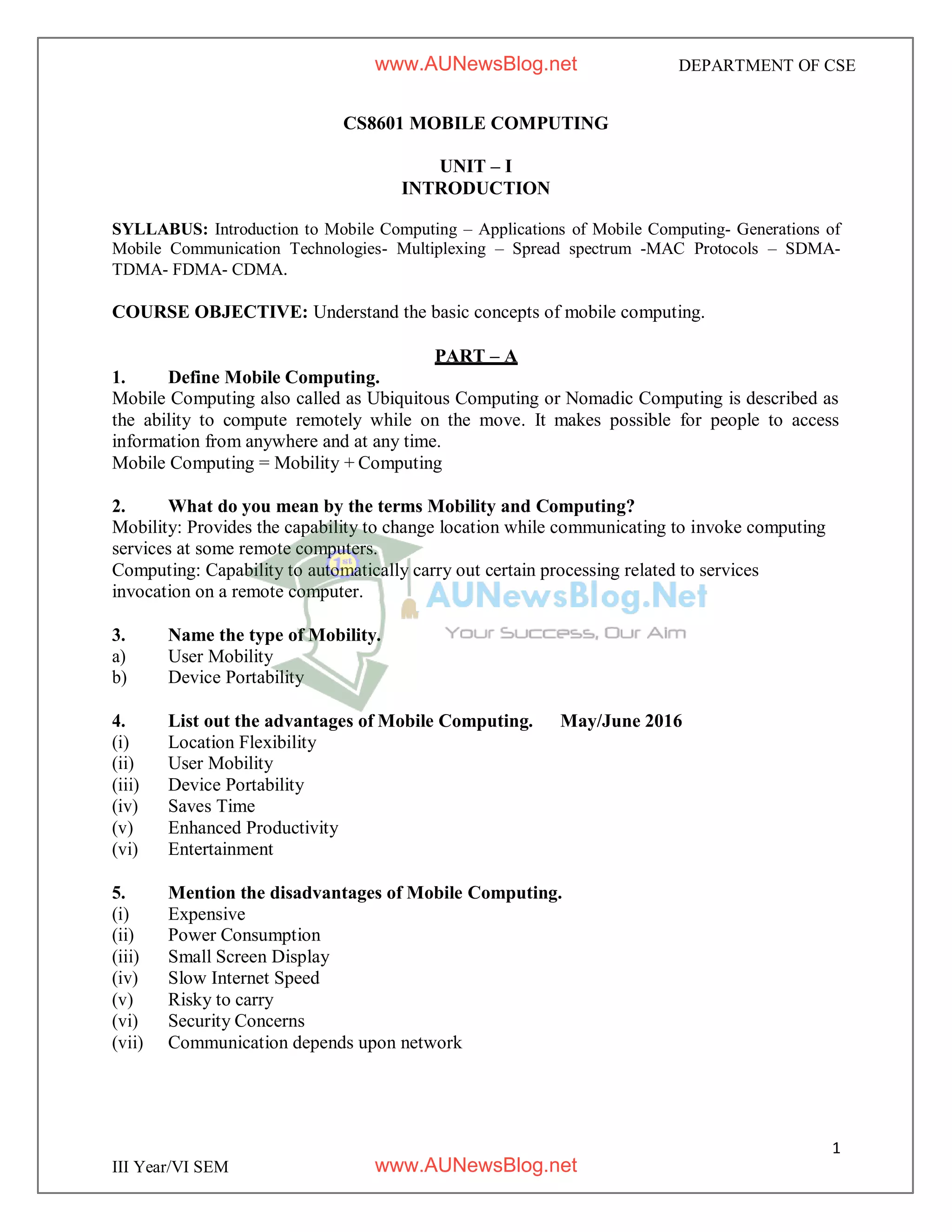 The document provides information about the syllabus for a mobile computing course. It includes: