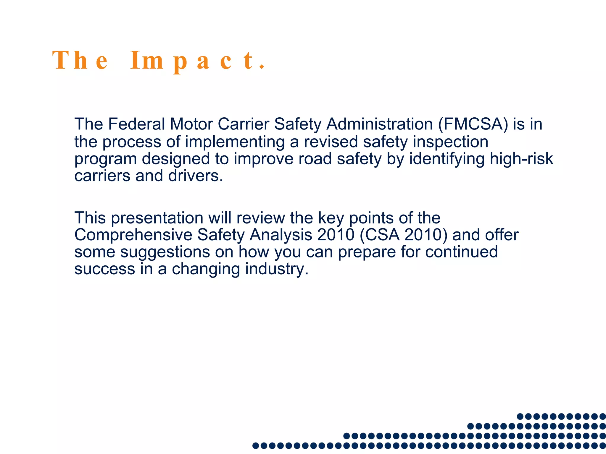 The FMCSA's CSA 2010 program aims to enhance road safety by identifying high-risk commercial motor vehicle carriers and drivers through a new safety measurement system. This initiative will impact all drivers and may lead to significant job losses due to stricter safety standards and pre-employment screening. CSA 2010 relies on data collection and scoring systems to assess safety performance, placing emphasis on maintaining clean inspection records and understanding carrier safety practices.
