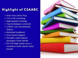 How to pass the 13 ten-minute consultations of the CSA exam? Get to know all the smart methods, comprehensive techniques, key red flags, and points with 4.5 hours of CSA preparation. You get a full breakdown of the marking criteria along with in-depth scoring tips. Get 3 free CSA consultation videos and top tips booklet. Visit the CSA ABC website for details. https://www.csaabc.co.uk/
