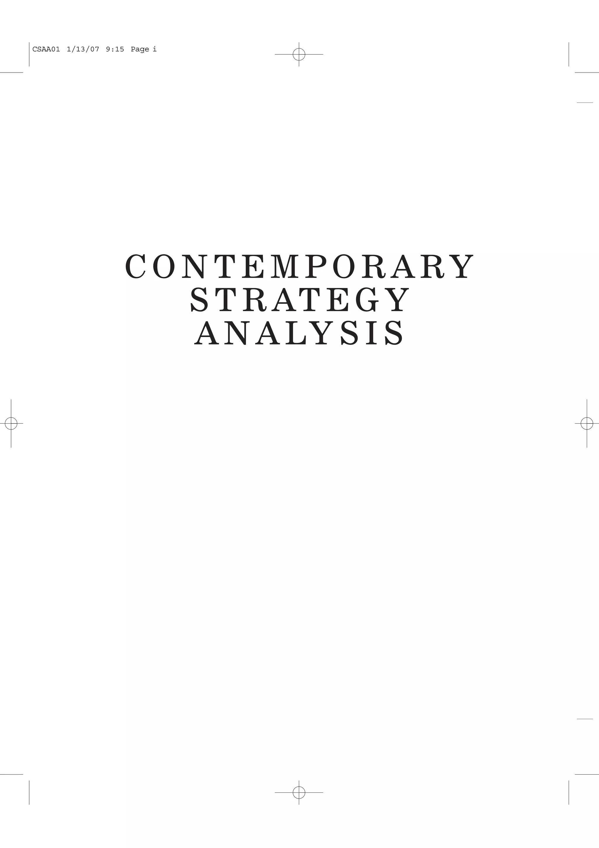 This document is the title page and contents of the sixth edition of the textbook "Contemporary Strategy Analysis" by Robert M. Grant. It provides information about the publisher, copyright, and brief listing of the book's parts and chapter titles. The textbook appears to cover topics such as the concept of strategy, industry and competitive analysis, analyzing resources and capabilities, and types of competitive advantage.