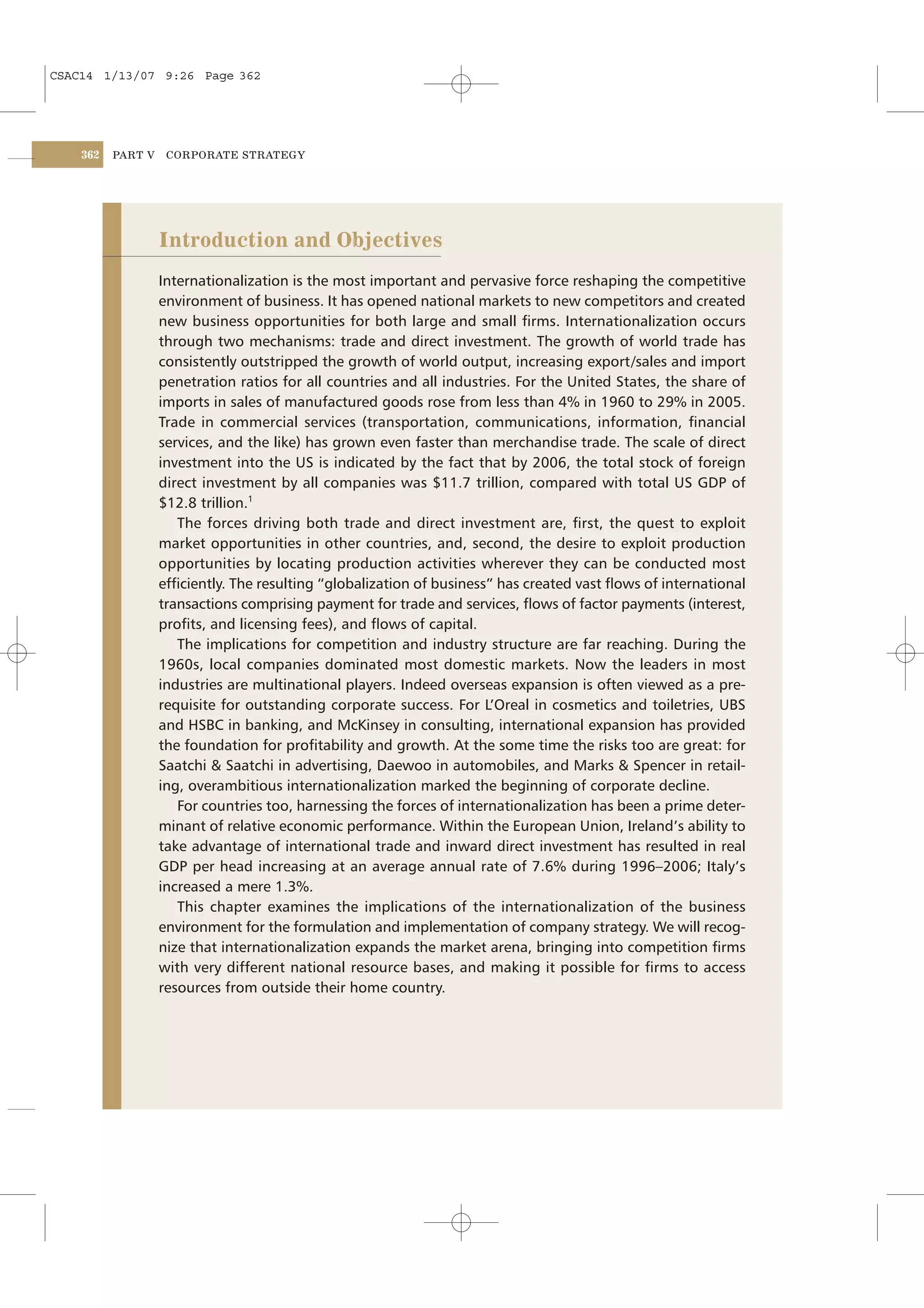 The document discusses how globalization has impacted industry analysis and competitive advantage for multinational corporations. It notes that internationalization has led to more competition as barriers to entry have fallen and national markets are now served by a more diverse set of global competitors. This has driven down industry concentration and profitability in many sectors. It also explains how a firm's competitive advantage is influenced not just by its own resources and capabilities, but also by the national environment in which it operates, such as the availability of key resources in that country.