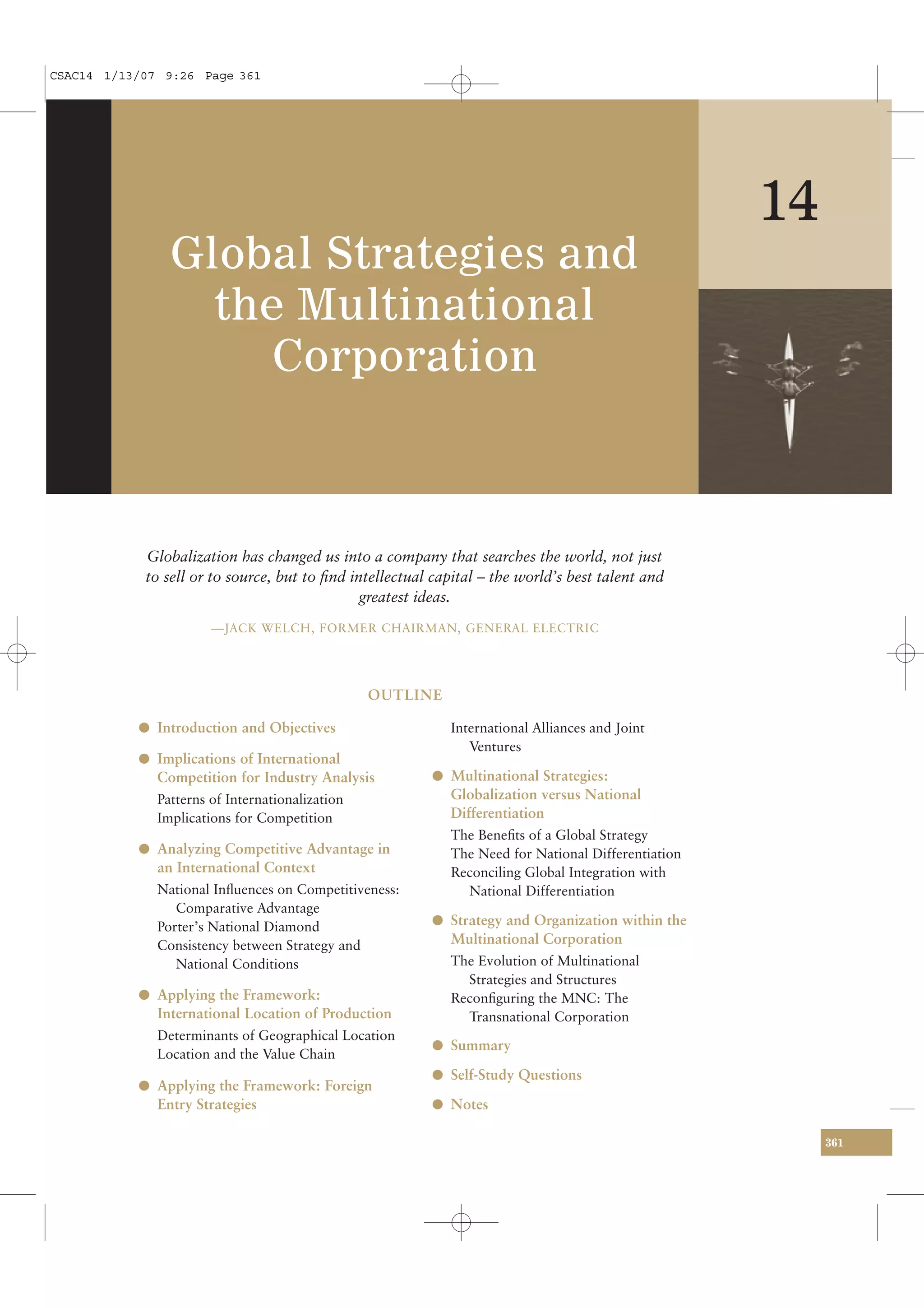 The document discusses how globalization has impacted industry analysis and competitive advantage for multinational corporations. It notes that internationalization has led to more competition as barriers to entry have fallen and national markets are now served by a more diverse set of global competitors. This has driven down industry concentration and profitability in many sectors. It also explains how a firm's competitive advantage is influenced not just by its own resources and capabilities, but also by the national environment in which it operates, such as the availability of key resources in that country.