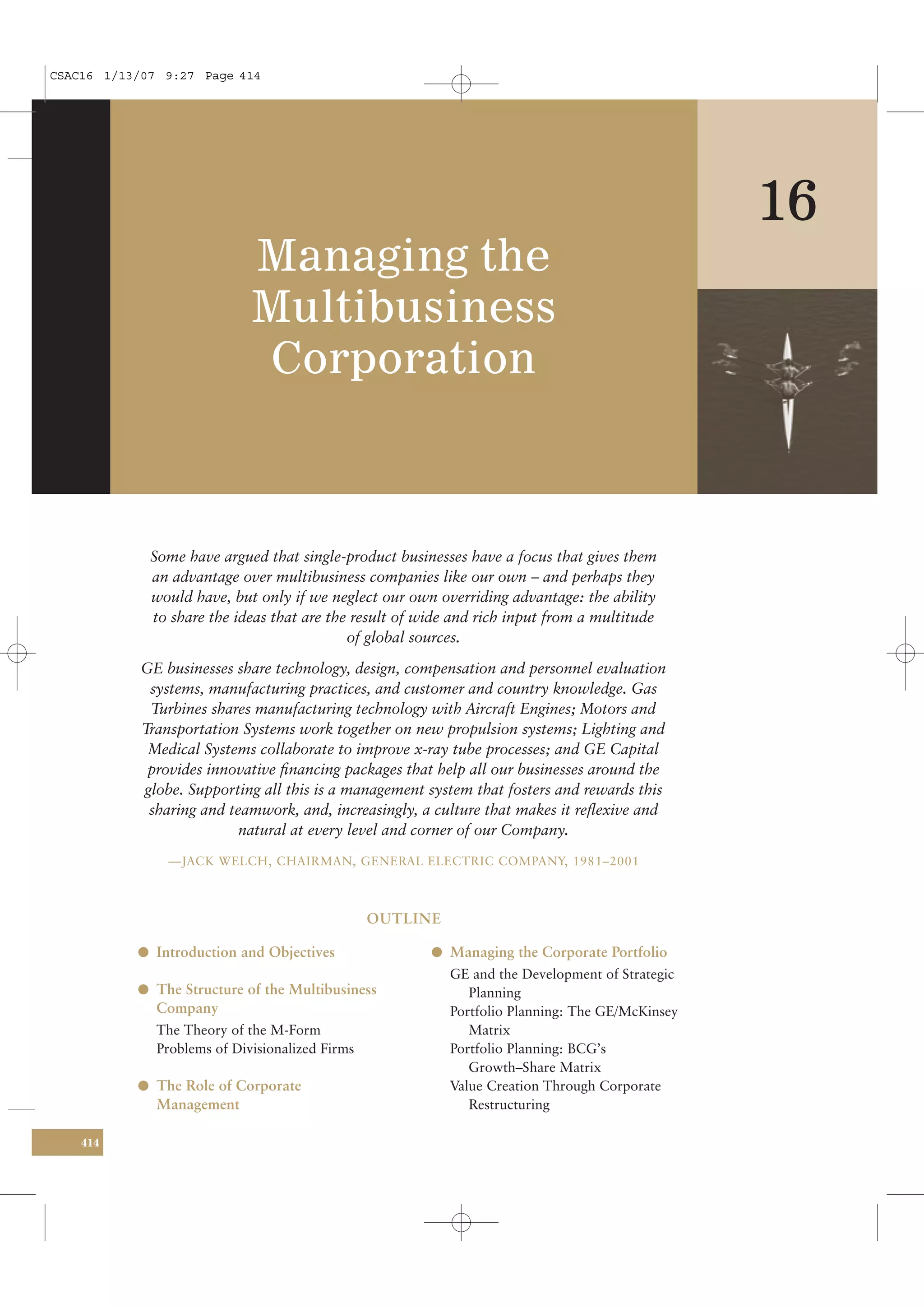 1) The document discusses managing multibusiness corporations, which typically use a multidivisional structure with divisions coordinated by a corporate headquarters.