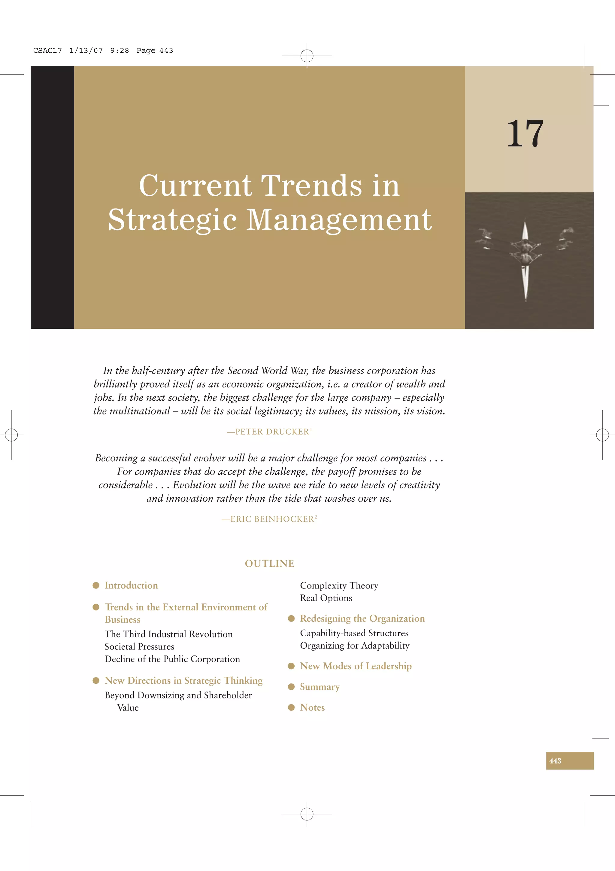 The document discusses current trends in strategic management. It covers trends in the external business environment including the third industrial revolution driven by digital technologies, societal pressures on businesses to be more socially responsible, and the decline of public corporations as more go private. It also discusses new directions in strategic thinking beyond just cost cutting and shareholder value, including a return to fundamentals of profitability and accessing more complex sources of competitive advantage.