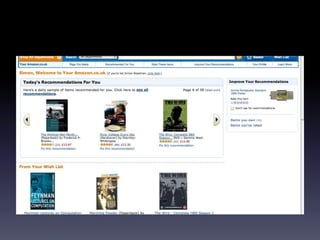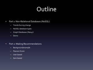 This document discusses collaborative filtering and recommender systems. It begins with an overview of non-relational databases and graph databases. It then discusses collaborative filtering, including calculating similarity scores between users or items, predicting ratings for unseen items, and making recommendations. Specific methods discussed include Euclidean distance, Pearson correlation, and user-based filtering. The goal of collaborative filtering is to increase sales, market share, and targeted advertising by making personalized recommendations to users.