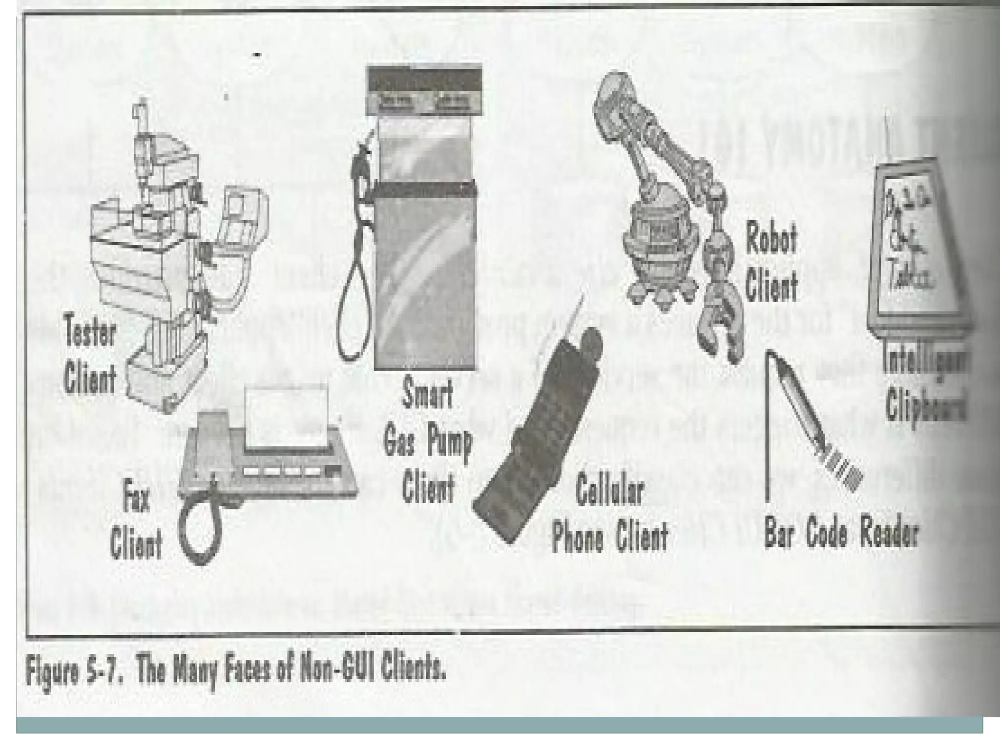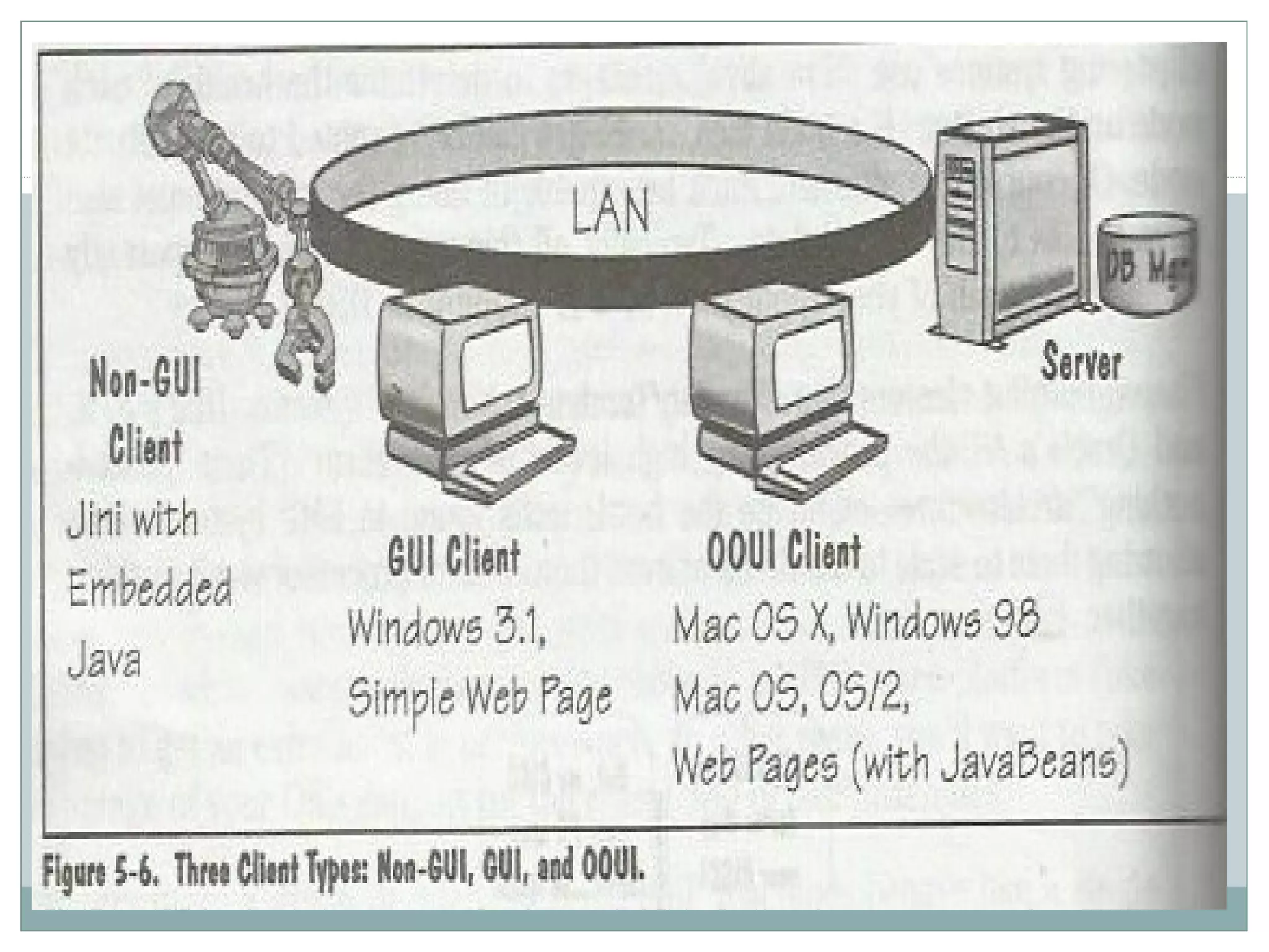 This document discusses different types of client-server computing. It describes three categories of clients: non-GUI clients like ATMs that require minimal human interaction; GUI clients that use graphical user interfaces; and OOUI clients that allow direct manipulation of objects. It also outlines the needs of clients from an operating system, including communication with servers, multitasking capabilities, and secure execution of mobile code. Trends are discussed as well, such as the growing diversity of client devices and the rise of application servers.