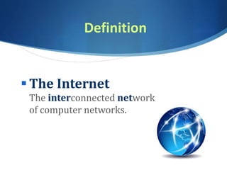 This document provides an overview of the history and components of the Internet. It discusses how ARPAnet in 1969 connected 4 computers and led to the development of the World Wide Web by Tim Berners-Lee in 1989. It describes the growth of Internet users from 1% of the world population in 1995 to over 40% today. Key components covered include browsers, URLs, IP addresses, protocols, and HTML. The document concludes with a discussion of content management systems used to create websites.