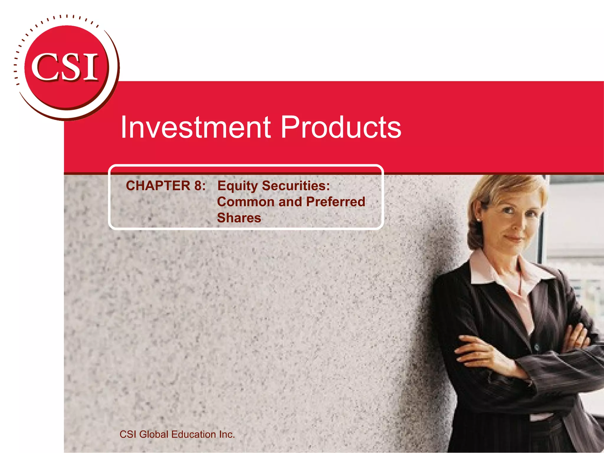 The document discusses various types of equity securities including common shares, preferred shares, and convertible securities. Common shares provide potential capital appreciation and dividends but come with more risk than preferred shares. Preferred shares entitle holders to fixed dividends that are paid out before common dividends but offer less upside potential. Convertible securities can be exchanged for common shares at a predetermined price and trade at the higher of their conversion value or pure investment value.