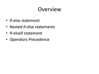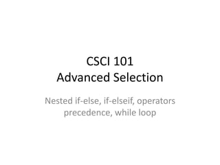 This document provides an overview of advanced selection concepts in MATLAB including nested if-else statements, if-elseif statements, operators precedence, and while loops. It includes examples of programs to sort numbers in ascending or descending order using these concepts and discusses how to repeat a program an unknown number of times using a while loop.