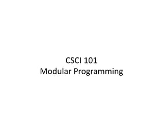 This document discusses modular programming and provides examples. It covers:
