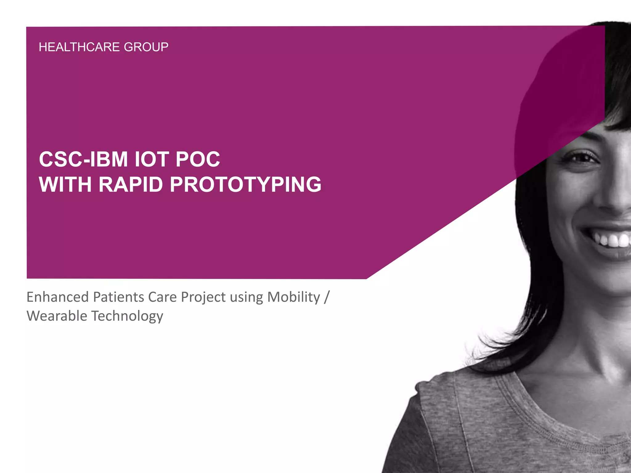 The document outlines a proof of concept for an enhanced patient care mobile application that uses wearable technology and analytics. It proposes: