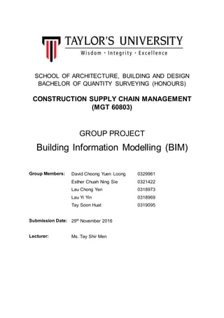 The document discusses Building Information Modeling (BIM) and its various dimensions ranging from 3D to 7D modeling. It provides details on the services, software, advantages and disadvantages of each dimension. The 3D model refers to visualization and clash detection. 4D adds a time component for construction planning and scheduling. 5D enables cost estimation and quantity take-off. 6D performs energy consumption analysis during design and operation. 7D covers facility management. The document is a group project report submitted by students for their Construction Supply Chain Management course that analyzes how each BIM dimension benefits supply chain management.