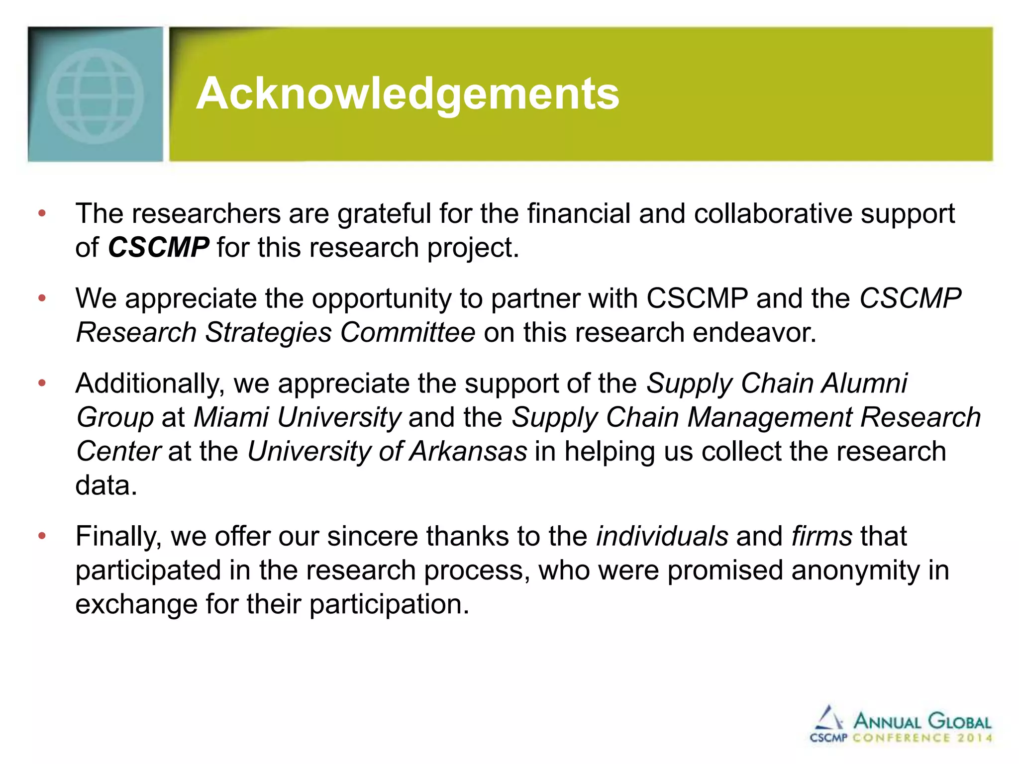 This document summarizes research on the use of big data in retail supply chains. The research included surveys of 174 supply chain managers and interviews with 18 senior managers. The research found that while big data use holds potential benefits, current use remains limited in scope and applications. Most companies are in the early stages of initiating big data programs using traditional transactional data from sources like POS and inventory systems. The research identified several factors that influence adoption of big data as well as capabilities needed for effective use. Companies making more advanced use of big data reported improved performance outcomes. Overall, the research suggests big data can provide rewards if companies develop the right mindset, processes, and capabilities to leverage it effectively.