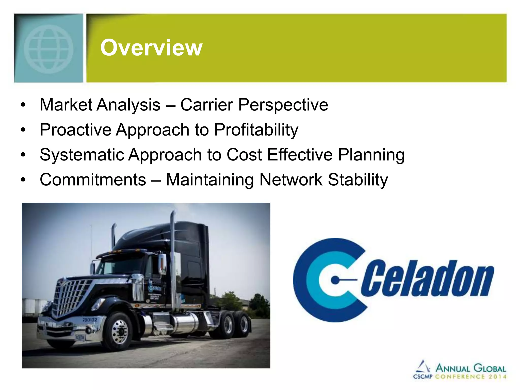Celadon Trucking is a transportation company established in 1985 that operates over 3,800 tractors and 9,200 trailers across various transportation services. The presentation discusses Celadon's proactive approach to profitability through data-driven methods and systematic cost-effective planning. This includes analyzing lane-level profitability and identifying opportunities, as well as maintaining network stability through commitments to customers. Celadon aims to balance operational costs, driver satisfaction, and customer service through an automated planning system that dispatches loads.