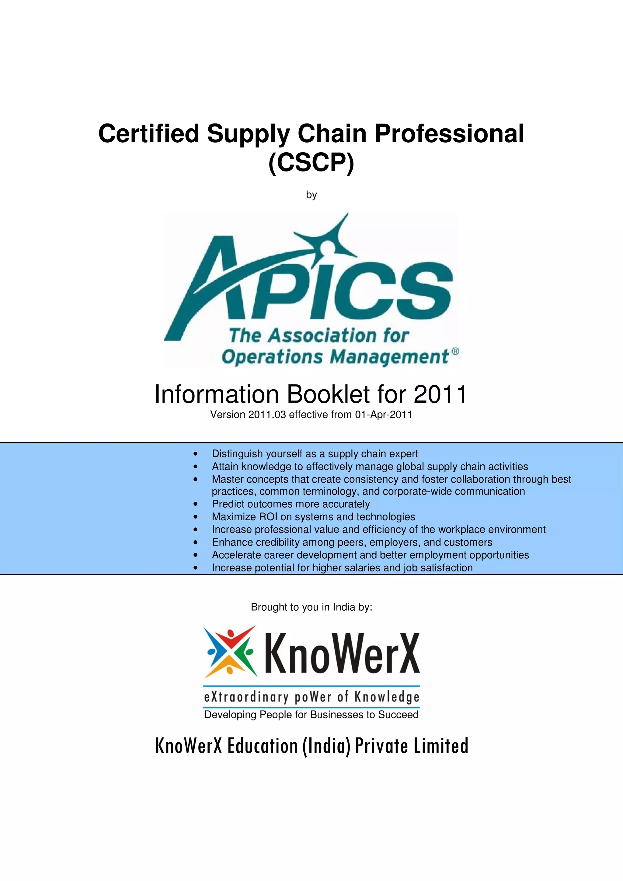 The document provides information about the Certified Supply Chain Professional (CSCP) certification from APICS. It outlines the four modules that make up the CSCP body of knowledge: Supply Chain Management Fundamentals, Building Competitive Operations, Planning and Logistics, Managing Customer and Supplier Relationships, and Using Information Technology to Enable Effective Supply Chain Management. Candidates must pass one comprehensive exam to earn the CSCP designation, which demonstrates mastery of the supply chain management body of knowledge. The certification can help individuals advance their careers and increase their salaries, while providing organizations with employees who have proven supply chain expertise.