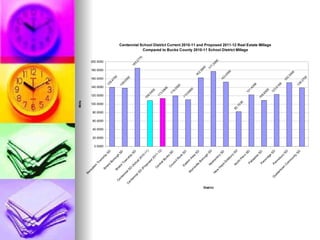1) It summarizes the 2011/12 proposed budget for Centennial School District, which includes a 4.64% increase in millage rate, $95.3 million in expenditures, and staffing reductions of 28 positions.