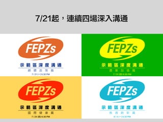 深 度 溝 通 總 體 政 策 篇 7 / 21 (一) 6:30 PM 示 範 區 深 度 溝 通 國 際 健 康 篇 7 / 24 (四) 6:30 PM 示 範 區 深 度 溝 通 農 業 加 值 篇 7 / 31 (四) 6:30 PM 示 範 區 深 度 溝 通 教 育 創 新 篇 8 / 4 (一) 6:30 PM