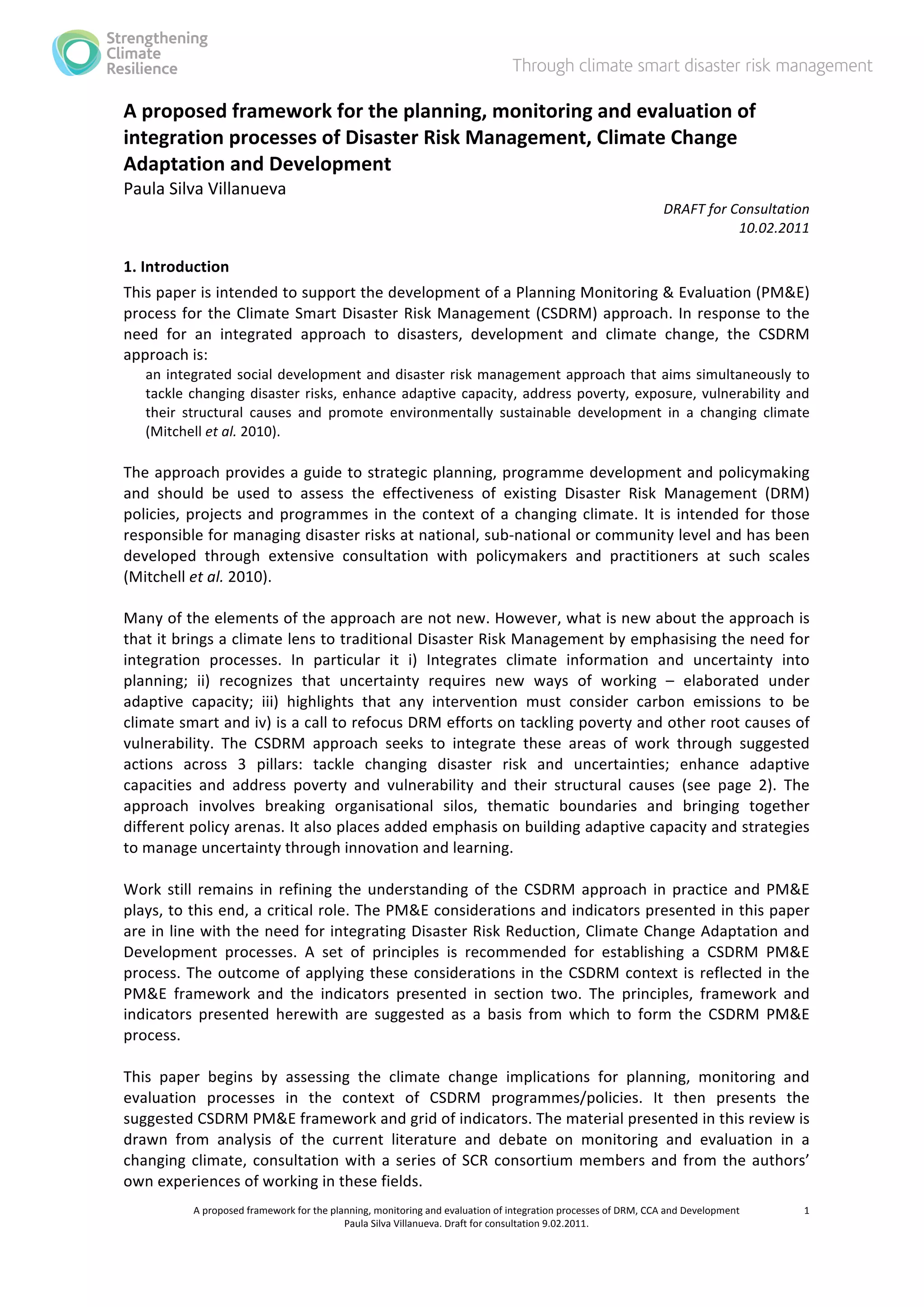 The document proposes a Climate Smart Disaster Risk Management (CSDRM) approach to strengthen climate resilience. The approach has three pillars:
