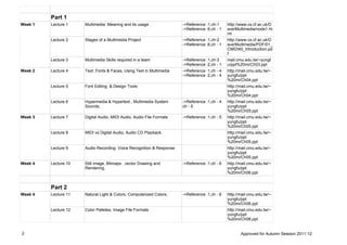 This document provides the course plan for a Multimedia Systems and Design course. It includes 3 lectures per week over 13 weeks for a total of 39 lectures. Each lecture has assigned reading from recommended textbooks and references multimedia concepts, tools, and technologies. Formative assessments include two midterm tests and three term papers on specified multimedia topics. The term papers allow students to research and write on advanced topics spending approximately 15 hours. The course aims to develop students' understanding of multimedia concepts and their practical applications.