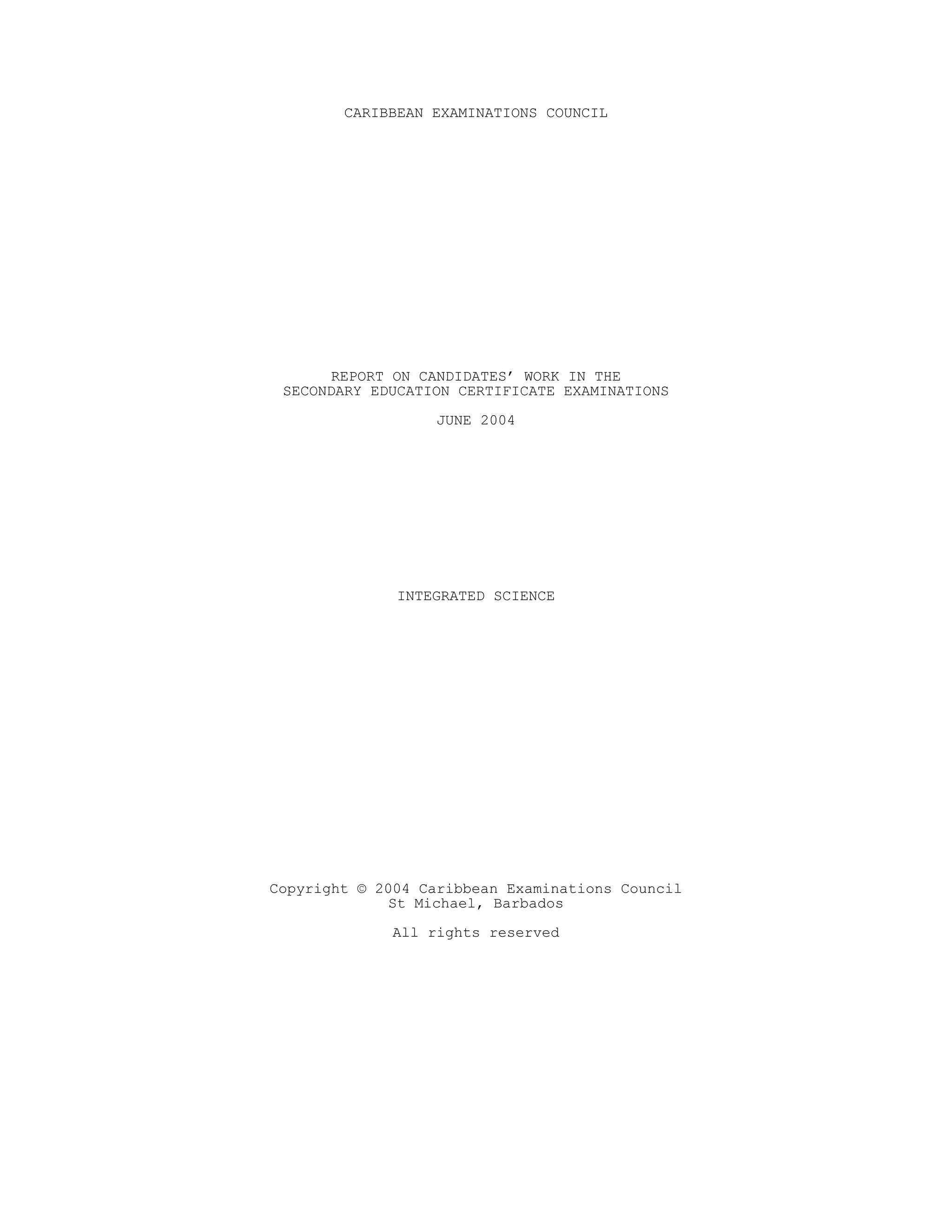 This document provides a report on the performance of candidates who took the Caribbean Examinations Council Secondary Education Certificate Examinations in Integrated Science in June 2004. It summarizes the results at both the basic and general proficiency levels. At the general proficiency level, there was a slight increase in enrollment and performance was satisfactory, with more candidates achieving grades I to III compared to the previous year. At the basic proficiency level, enrollment and performance decreased compared to the previous year, with fewer candidates achieving the top grades. The report then provides detailed comments on candidate performance on each exam paper.