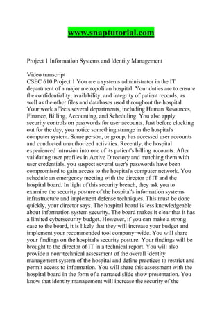 1. The student is asked to examine security of a hospital's information infrastructure and make recommendations. Assessments will include a technical report and non-technical presentation.