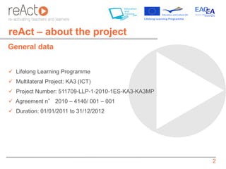 This document describes a project called reAct that aims to connect dropout students and their teachers to lifelong learning practices using new technologies. The project involves partners from several European countries and seeks to develop a new learning approach centered around 7 principles like trust, challenge, and creativity. It will pilot this approach through collaborative online and in-person activities for teachers and students. The pilot will go through phases of familiarization, collaborative creation of international and national projects, and final integration of the new methods. The goal is to inspire a change in attitudes towards learning and improve prospects for students. Initial teacher training and student experiences from Portugal are also described.
