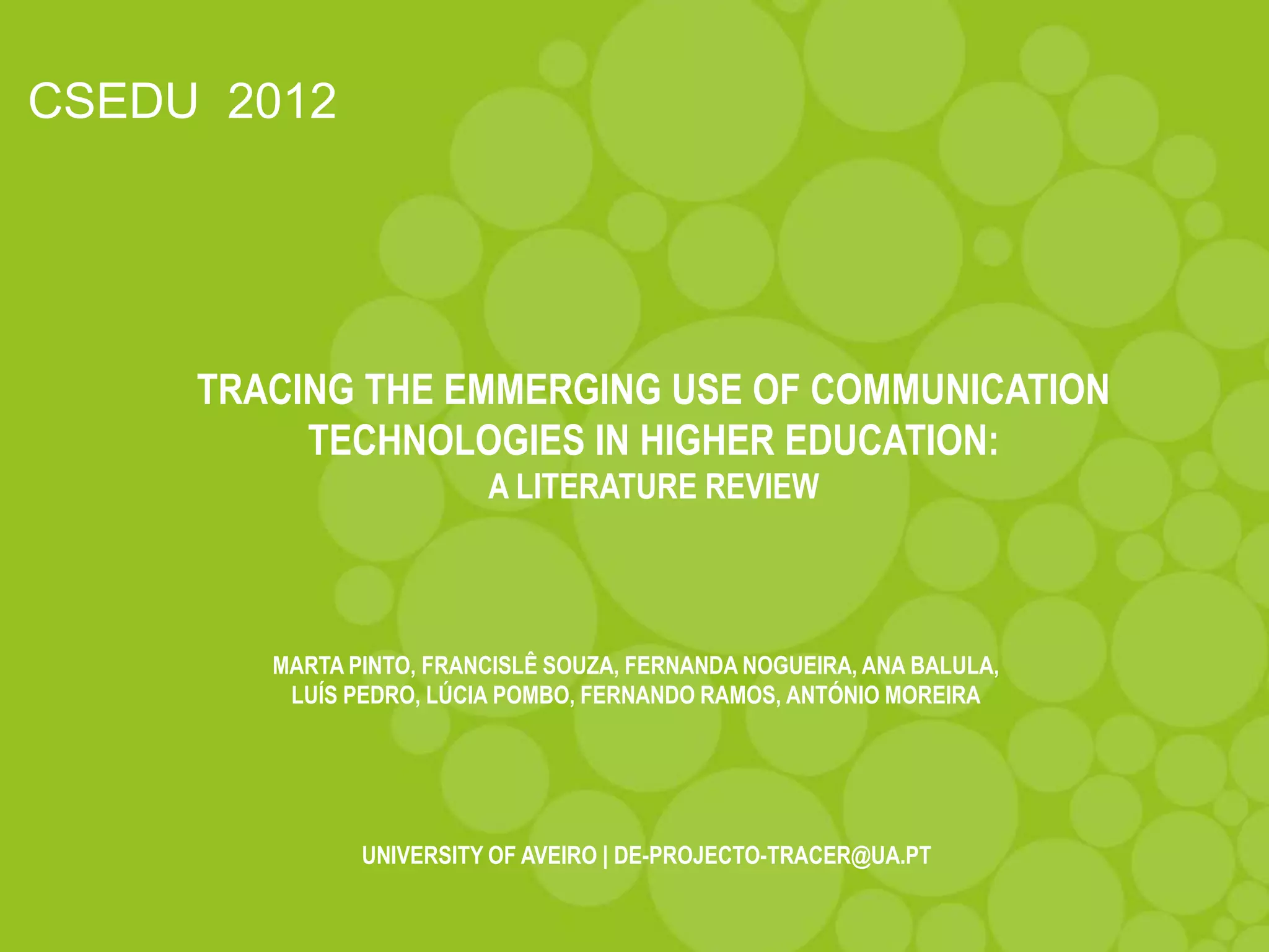 This document provides a literature review on the emerging use of communication technologies (CTs) in higher education. It summarizes that CTs, especially Web 2.0 tools, are increasingly being adopted in higher education to support teaching and learning. Popular tools include social networking sites, wikis, media sharing, virtual worlds, and personal learning environments. While CTs are disrupting traditional teaching methods, their integration into higher education is still a work in progress, with gaps in infrastructure and teacher training remaining barriers to adoption. The review aims to understand which CTs are used and how to inform the ongoing TRACER project analyzing CT adoption in Portuguese universities.