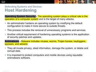 The document discusses various methods for defending computer systems and networks from security threats. It covers topics like hardening operating systems by removing unnecessary programs and services, applying security patches and antivirus software. It also discusses securing servers and networks by managing remote access securely, restricting ports and services, securing network devices like routers and switches, and implementing physical security controls for facilities like access control systems and video surveillance.