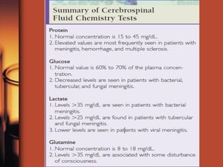 Cerebrospinal fluid (CSF) provides nutrients and removes waste from the central nervous system. CSF analysis can help diagnose diseases affecting the brain and spinal cord like infections, bleeding, tumors, and inflammation. CSF is collected via lumbar puncture and analyzed through various tests. Microscopic examination identifies cell types which can indicate conditions, and microbiological tests can identify infectious organisms. Overall, CSF analysis is a valuable tool for evaluating central nervous system diseases.
