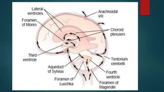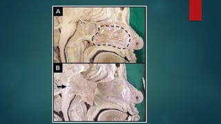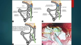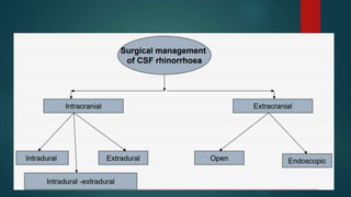 The document discusses cerebrospinal fluid (CSF) rhinorrhea, including its physiology, causes, and clinical presentation. It outlines the diagnosis through various tests and imaging techniques, as well as management strategies, both conservative and surgical. It emphasizes the importance of identifying the site of CSF leakage for effective treatment.