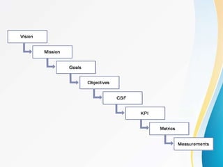 The document discusses critical success factors (CSFs) and key performance indicators (KPIs). CSFs are things that must happen for an activity like a service, process, project, or plan to succeed. KPIs are metrics used to measure achievement of CSFs and help manage activities. The document provides examples of vision and goal statements, KPIs, and CSFs for improving customer satisfaction at a company and increasing market share for a coffee chain.