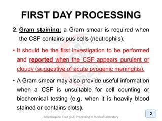 1. The document discusses the procedures for examining cerebrospinal fluid (CSF) samples in a medical laboratory, including gram staining, cell counting, and culture. Gram staining should be performed first to detect the presence of bacteria or yeast. A cell count is also required to determine the type and number of white blood cells present. CSF samples showing signs of infection based on gram stain or cell count should be cultured. The goal is to rapidly diagnose conditions like bacterial or fungal meningitis.
