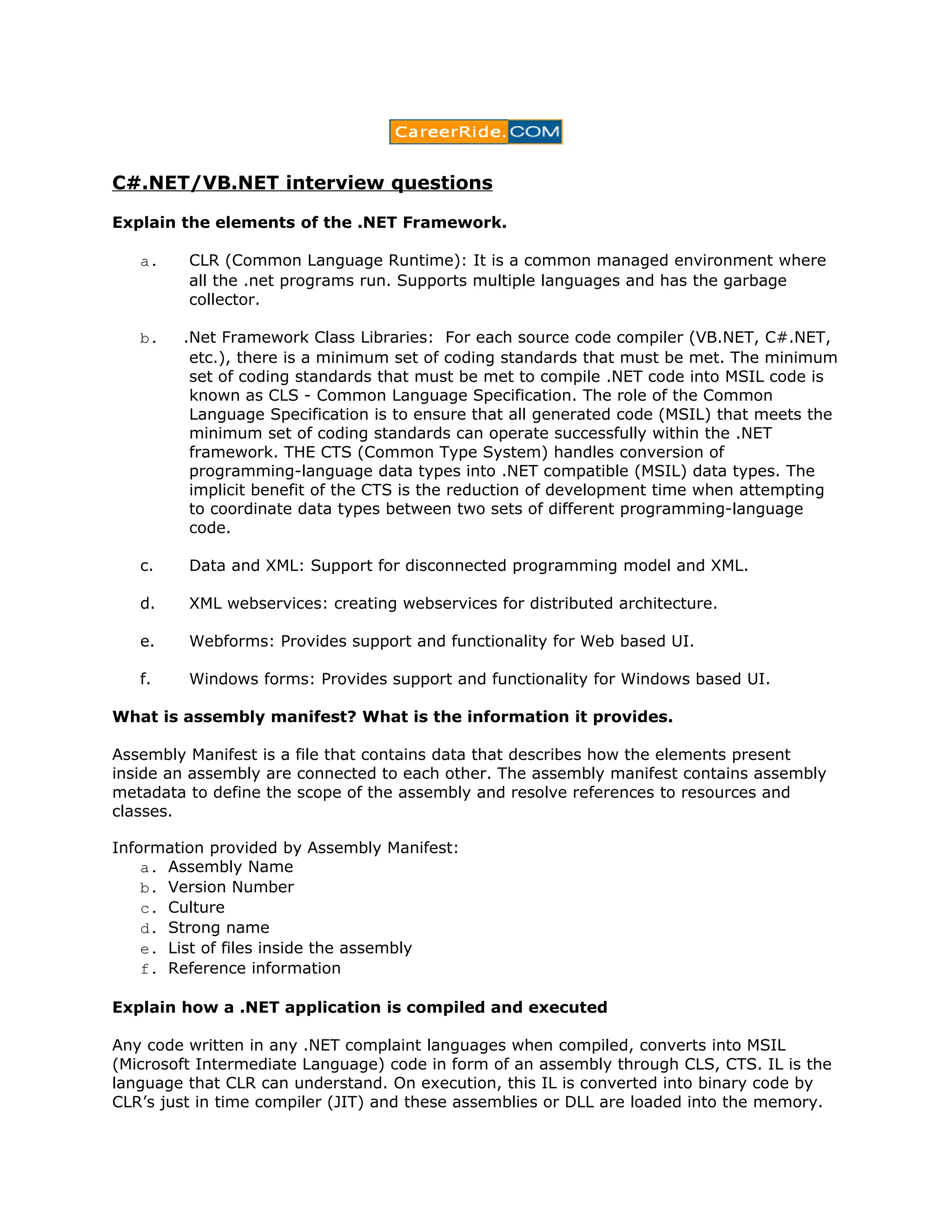 The document discusses elements of the .NET framework including CLR, class libraries, data and XML support, web services, web forms, and windows forms. It also covers assembly manifests, how .NET applications are compiled and executed, the base class library, value types vs reference types, and garbage collection. Key points include that the CLR allows managed code to run in a common language runtime, class libraries provide reusable functionality, and the assembly manifest contains metadata about an assembly.