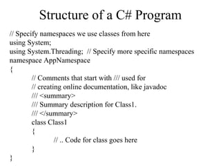 C# programs use namespaces and classes. A class defines methods and variables. C# supports inheritance, interfaces, structs, and enums. The main method runs code. Common data types include primitive types like int and reference types like string. C# can read input, perform math operations, and conditionally execute code using if/else statements. Methods can pass parameters by value or reference.