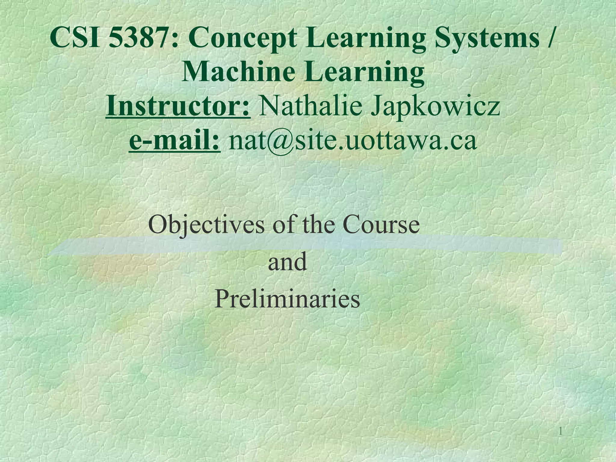 This document provides information about the CSI 5387: Concept Learning Systems / Machine Learning course taught by Dr. Nathalie Japkowicz. The objectives are to introduce machine learning principles, paradigms, and approaches. Students will read and present research papers, and complete a final project proposing and implementing a novel learning scheme. Course requirements include weekly paper critiques, 1-2 presentations, assignments, a project proposal, report, and presentation.